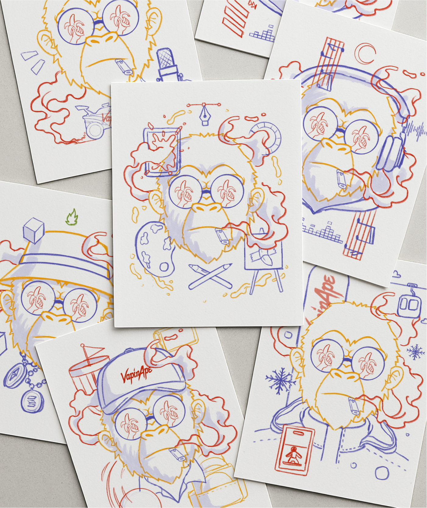 The brief to Angga was simple: take the familiar silhouette of our current face logo and evolve it into something with personality—something we can build on across strains, drops, and future campaigns. Think “collectible” energy (almost like an NFT set), but grounded in product storytelling: an ape that can show up in different moods, environments, and micro-narratives while still being unmistakably Vapin Ape.